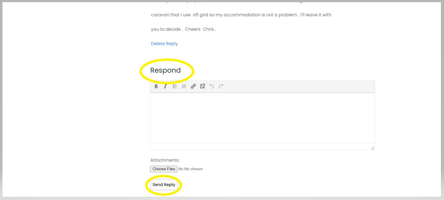 If you click on any message received it will expand the preview text and you will be able to see the message in full and any previous conversations. At the bottom of the message thread is the Respond box. This will allow you to reply to the message by entering desired text (and/or attachments). Once you are ready to send your message, you simply click on the Send Reply button.
