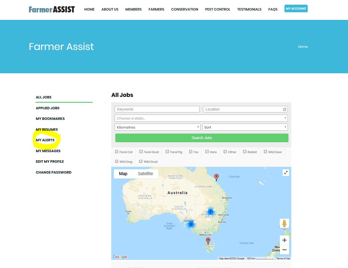 Step one is to log into the SSAA Farmer Assist portal and select My Alerts from the menu.